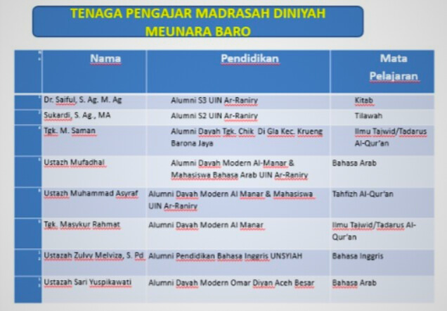 Tenaga pengajar merupakan alumni perguruan tinggi Islam dan lembaga pendidikan dayah, di antaranya Universitas Islam Negeri Ar-Raniry, Dayah Modern Al-Manar, serta lembaga pendidikan Islam lainnya yang memiliki reputasi baik dalam pengembangan keilmuan Islam.