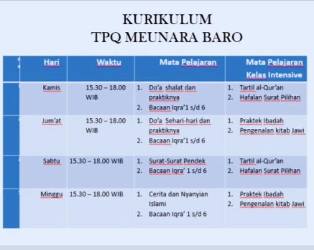 Taman Pendidikan Al-Qur’an (TPQ) Meunara Baro merupakan lembaga pendidikan Islam nonformal di bawah naungan Yayasan An-Nur yang berkomitmen membina generasi Qur’ani sejak usia dini. Kurikulum TPQ Meunara Baro dirancang secara terstruktur, bertahap, dan aplikatif untuk menanamkan kecintaan anak-anak terhadap Al-Qur’an, ibadah, serta nilai-nilai Islam dalam kehidupan sehari-hari.